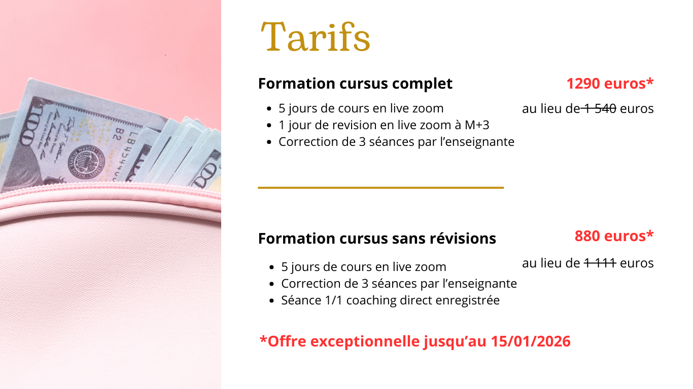 Si vous avez reçu un autre enseignement en ligne ou en présentiel et que vous ressentez le besoin d’interaction, de pratique supervisée et de “coaching” afin de vous lancer sereinement, alors l’option révisions et présentiel est pour vous.